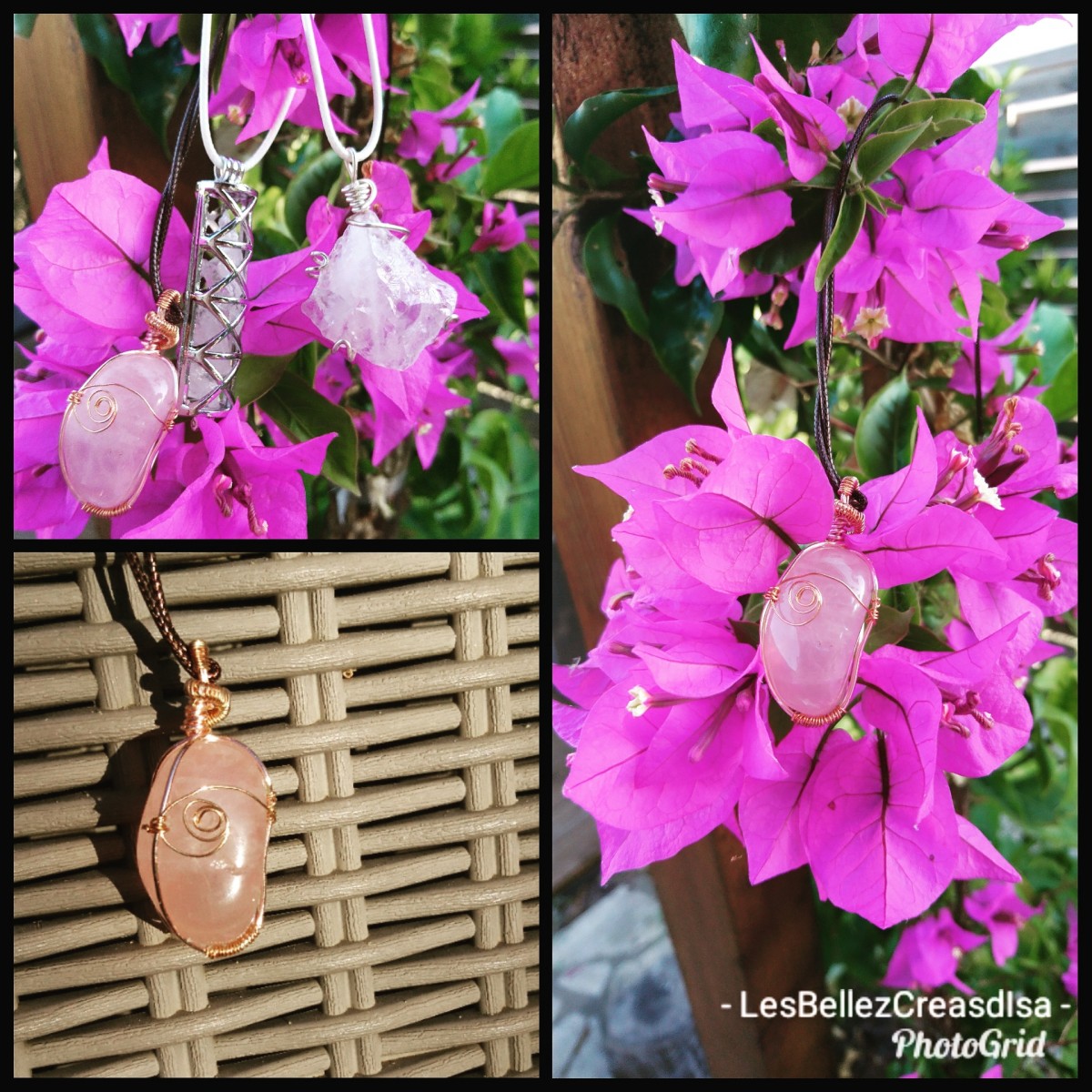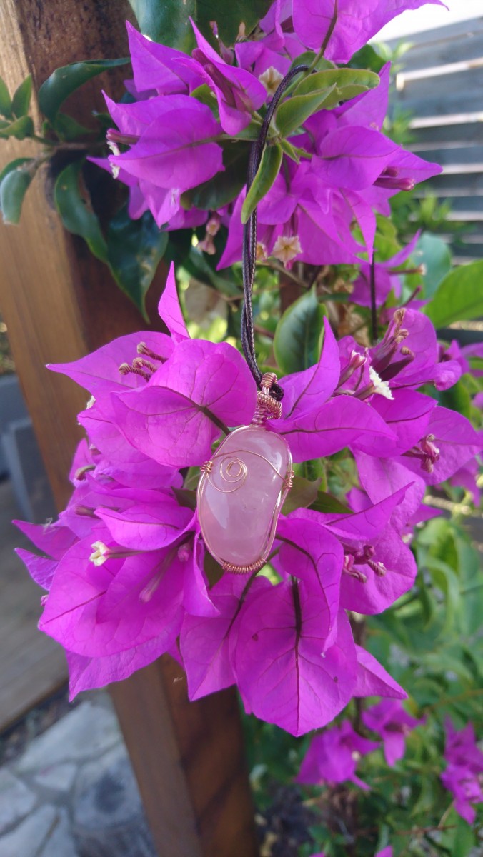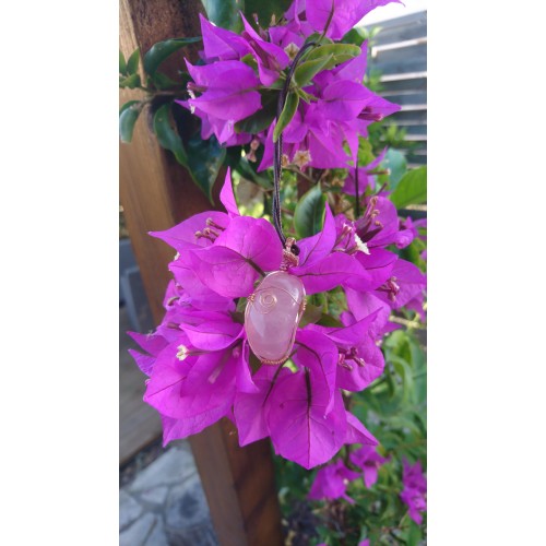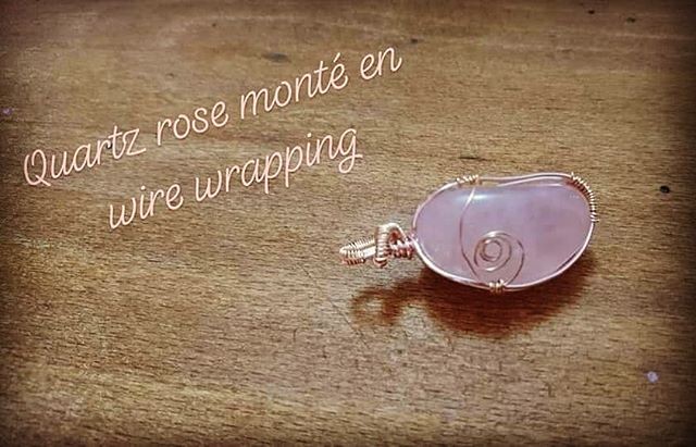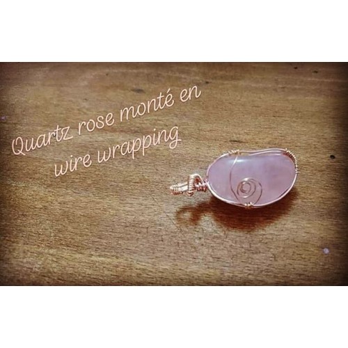 Joli pendentif en wire wrapping, pierre roulée de quartz rose entourée de fils de cuivre couleur vieux rose.
