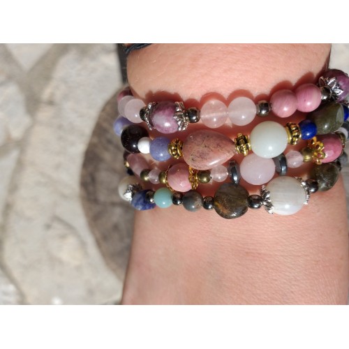 Un bracelet girly idéal pour les ados en plein apprentissage ou une working girl débordée, en pierres naturelles, perles verres, perles tchèques en verre, perles strass, perles métal