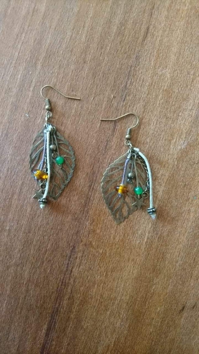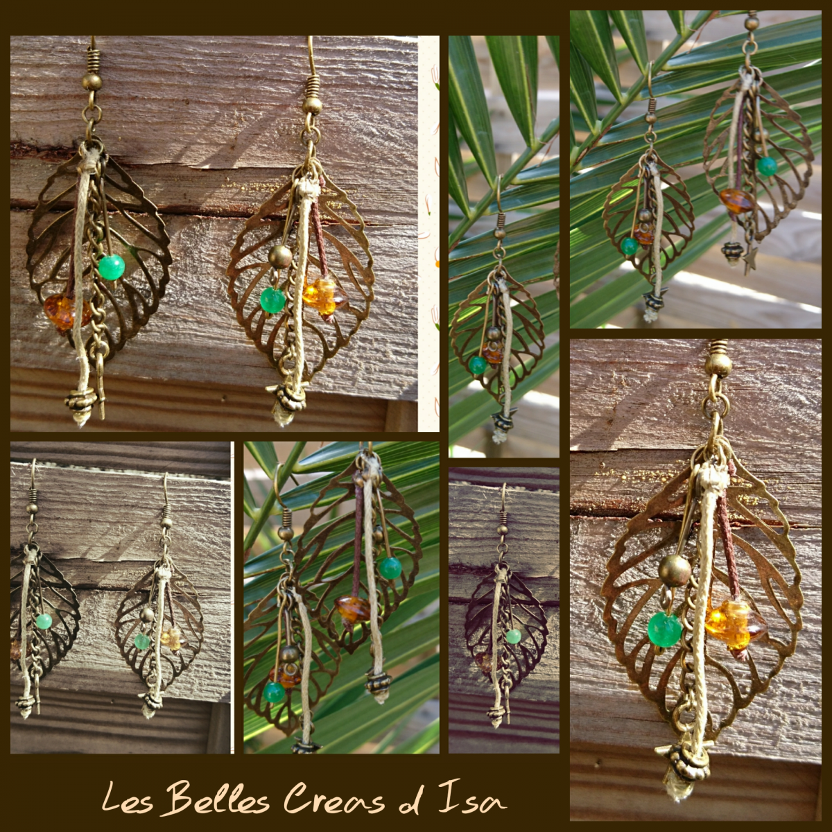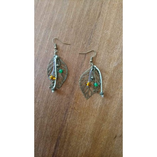 Boucles d oreilles pendantes feuilles bronzes et perles