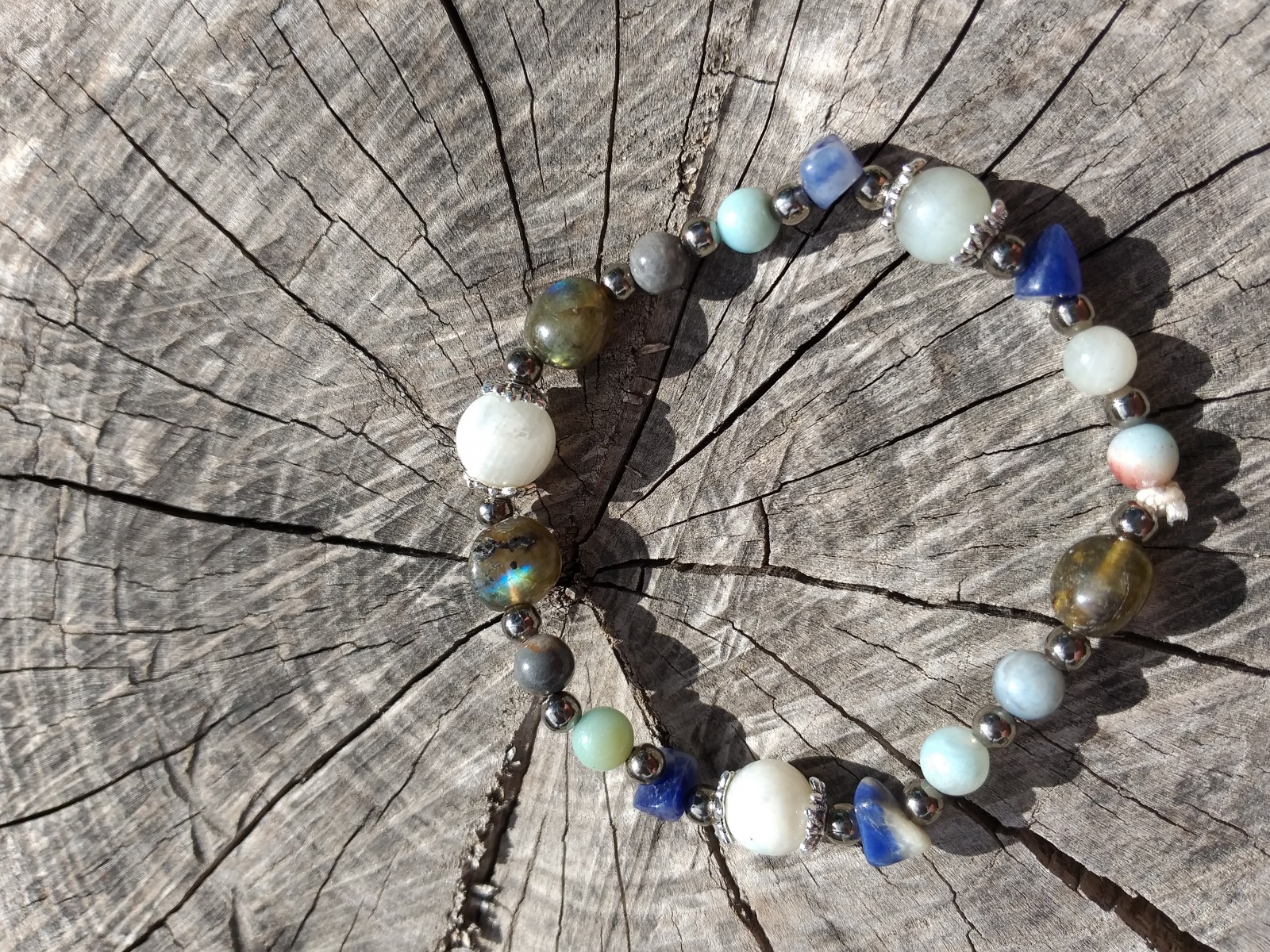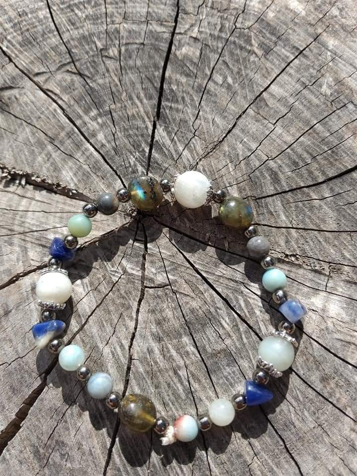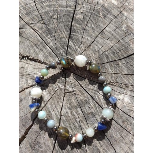 Bracelet composé de chips de sodalite, perles de labradorite, d'amazonite, de pierre de lune et perles fantaisies.