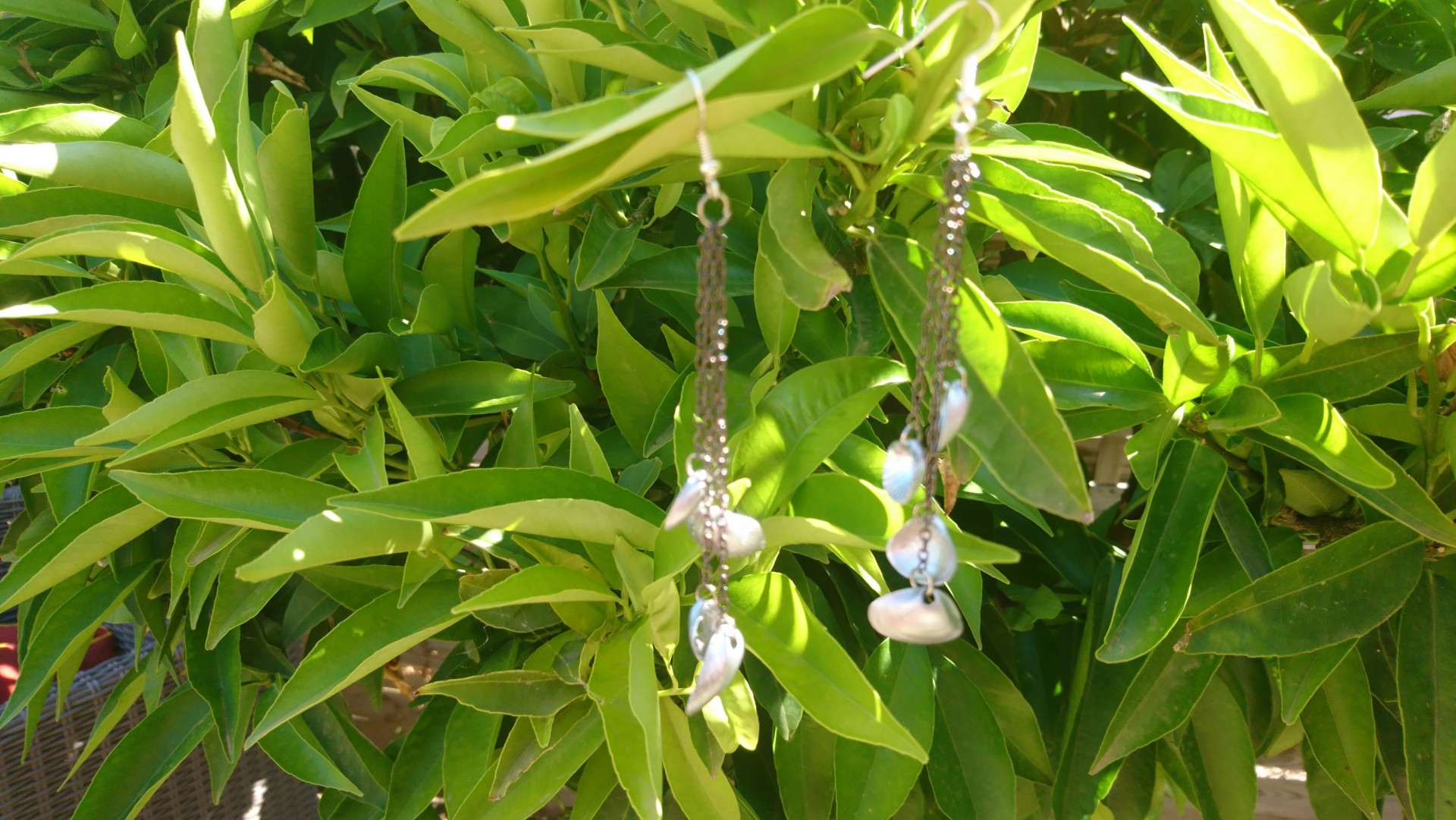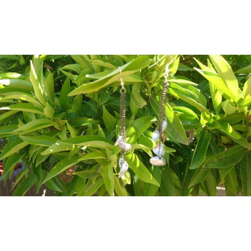 Boucles d'oreilles fabriquées à partie de coquillages ramassés sur le bord de la méditérannée et peind en couleur argentée.