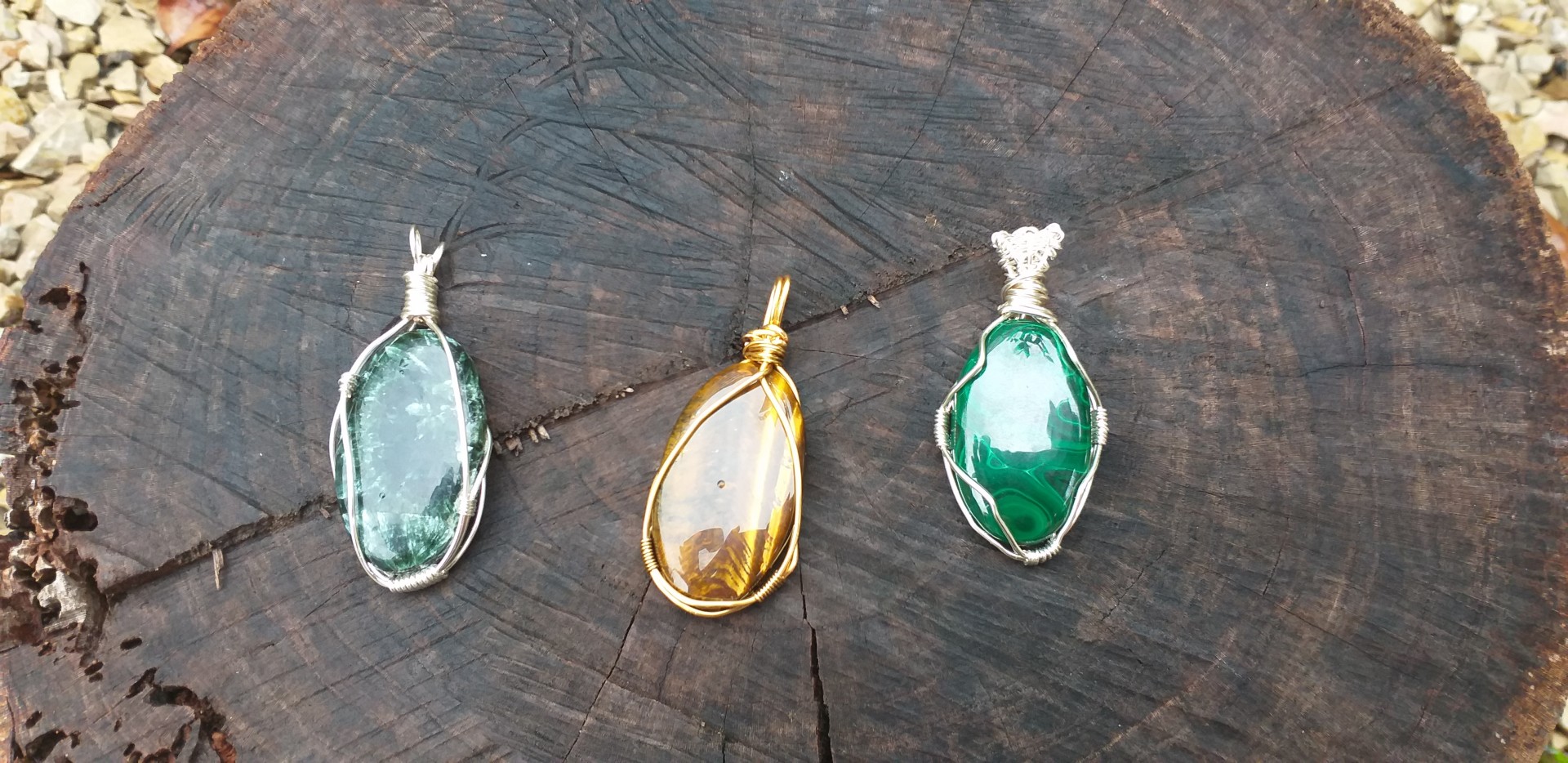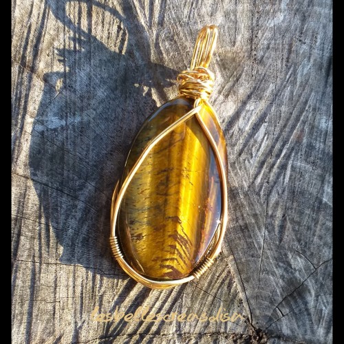 Pendentif en Oeil de tigre - 6 cm , monté en wire wrapping avec du fil de couleur doré.