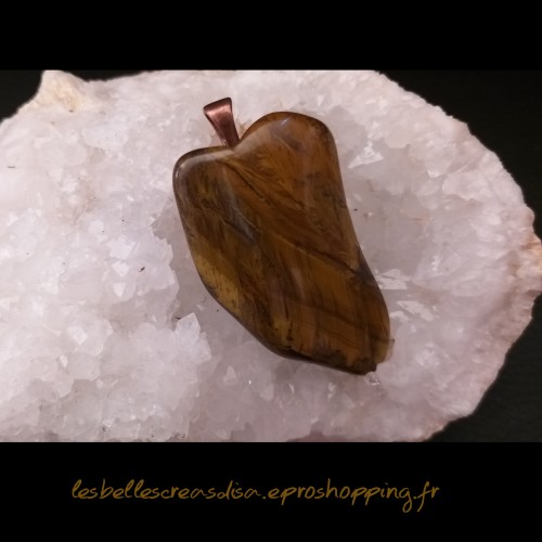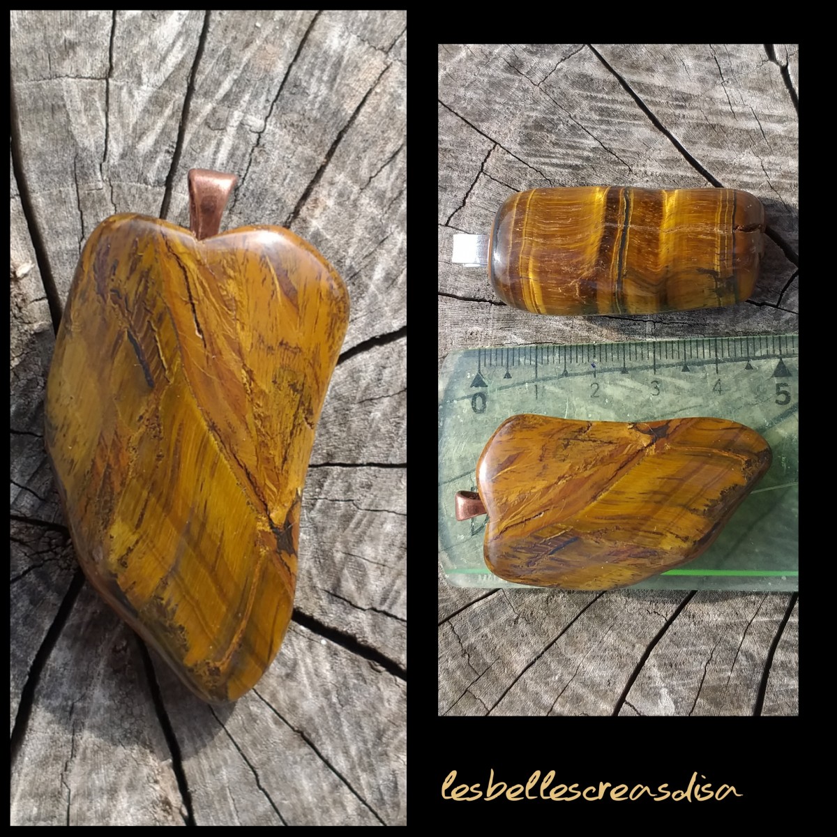 Pendentif en pierre naturelle, oeil de tigre, forme originale et unique qui rappelle la forme naturelle des feuilles, pour ce pendentif qui vous apporte une protection douce pour celui qui la porte , l oeil de tigre est une pierre d énergie , de chance et de protection.