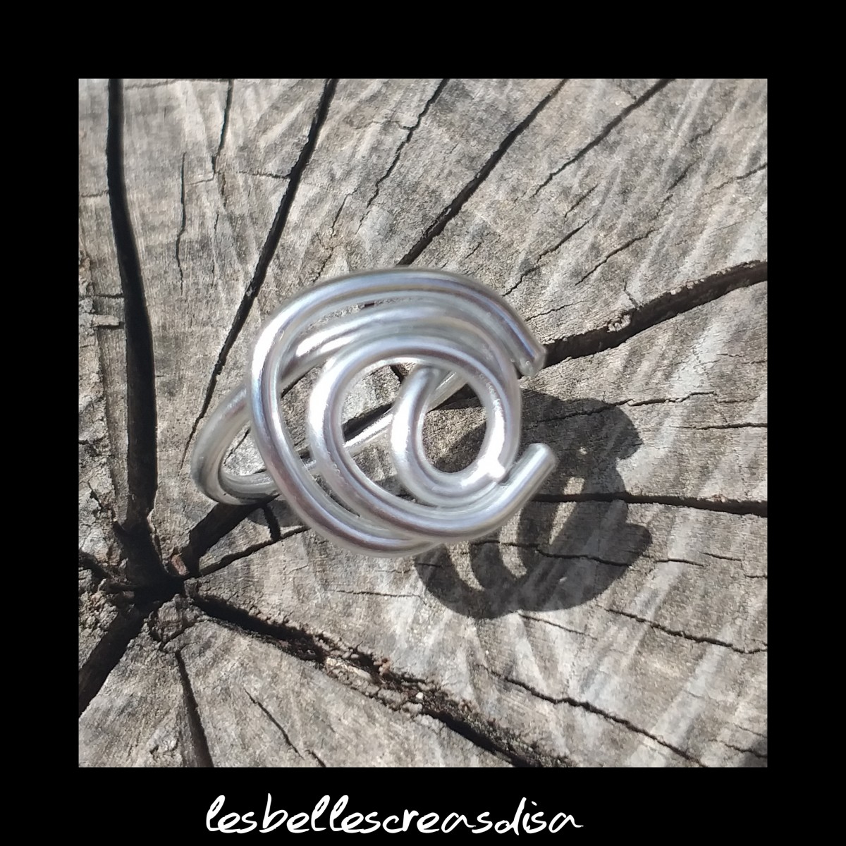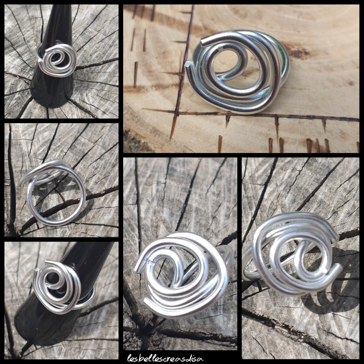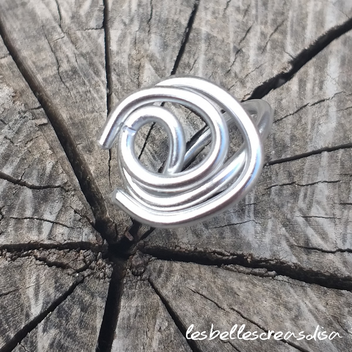 Bague en aluminium réalisée à la main, en un seul exemplaire, avec du fil d'aluminium de couleur gris argent, avec la technique du wire wrapping.
