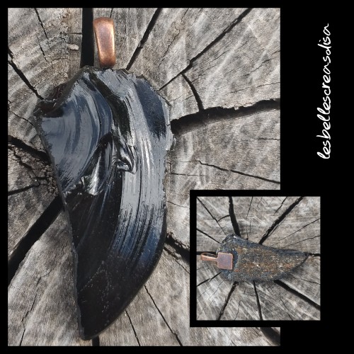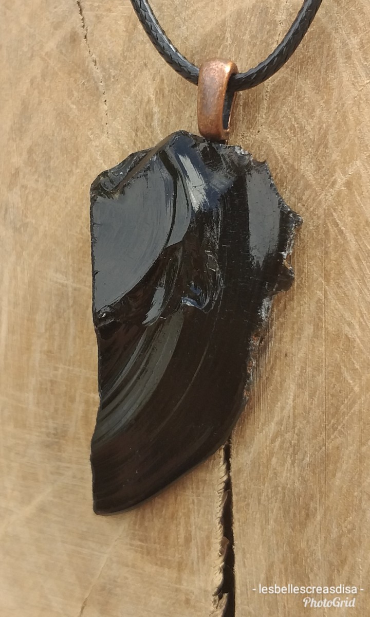 Ce pendentif à une forme de flèche très naturelle, l'obsidienne était d'ailleurs auparavant utilisée comme "couteau". La pierre est très tranchante, j'ai d'ailleurs limés les bords, afin de vous éviter toutes coupures.