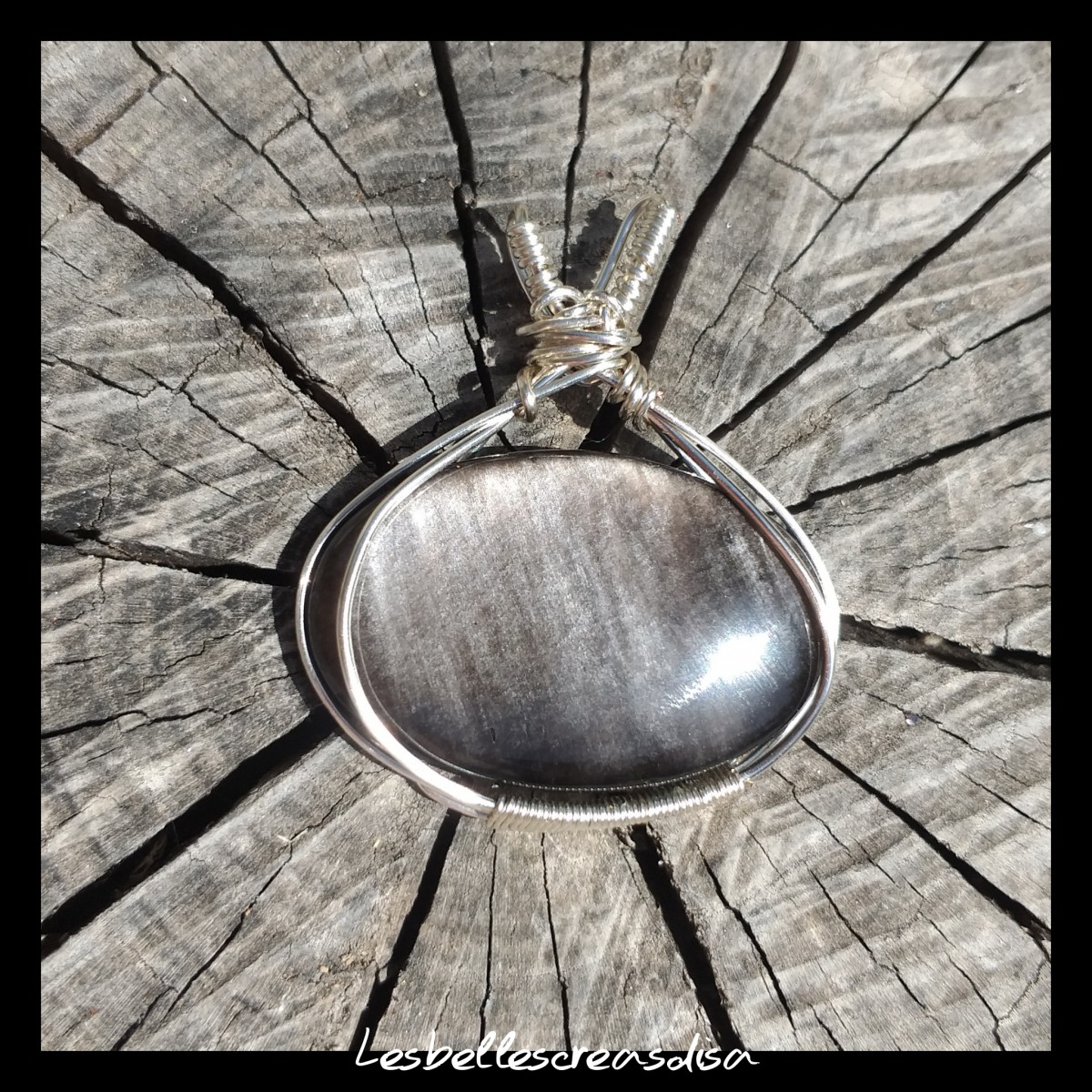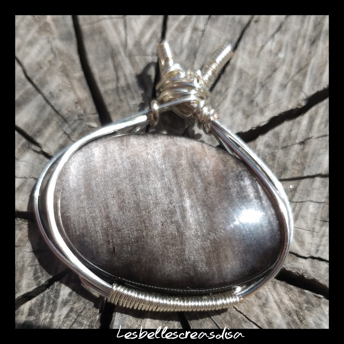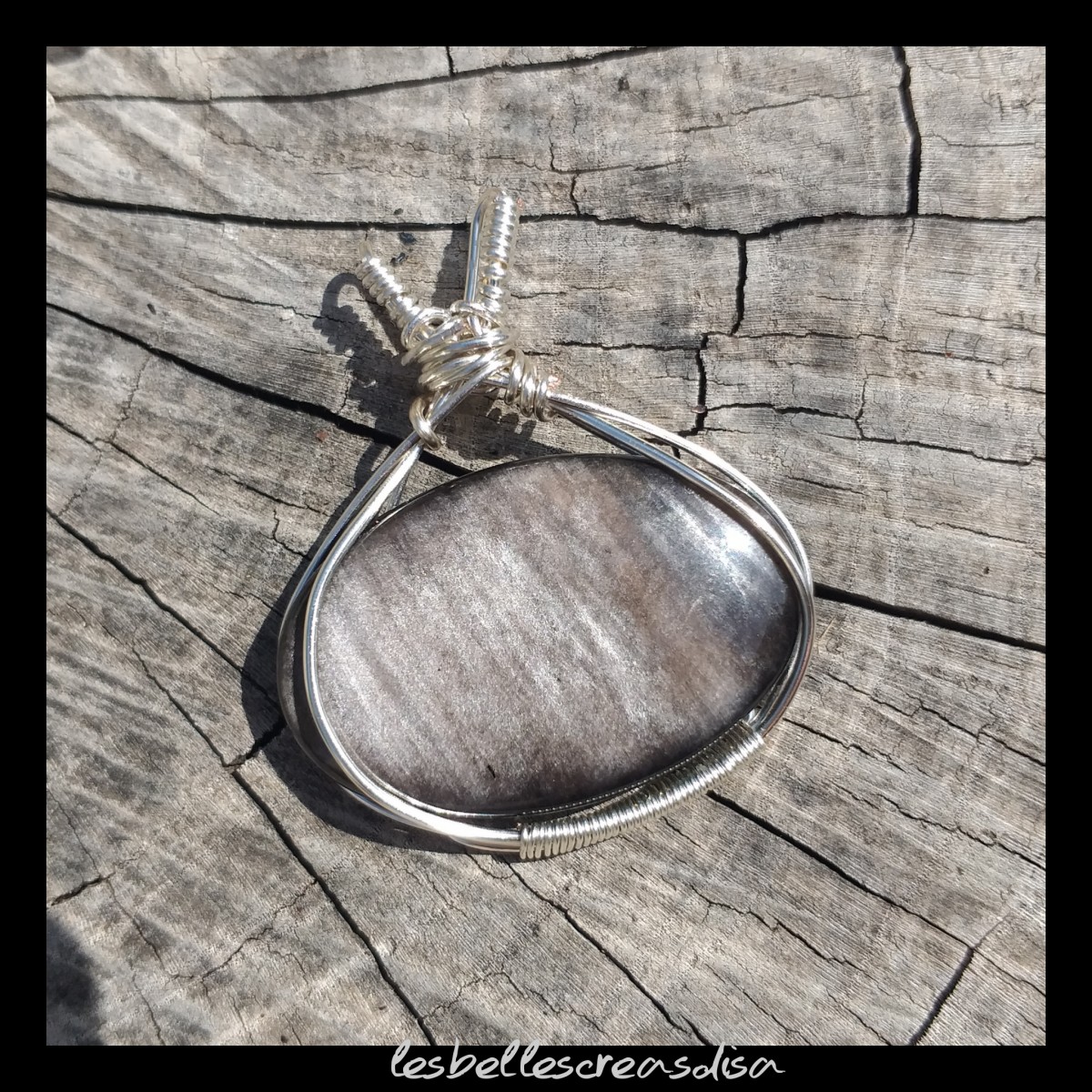 Le cabochon a été monté en pendentif avec la technique du wire wrapping ou fil enroulé, à partir de fil de cuivre en plaqué argent.
