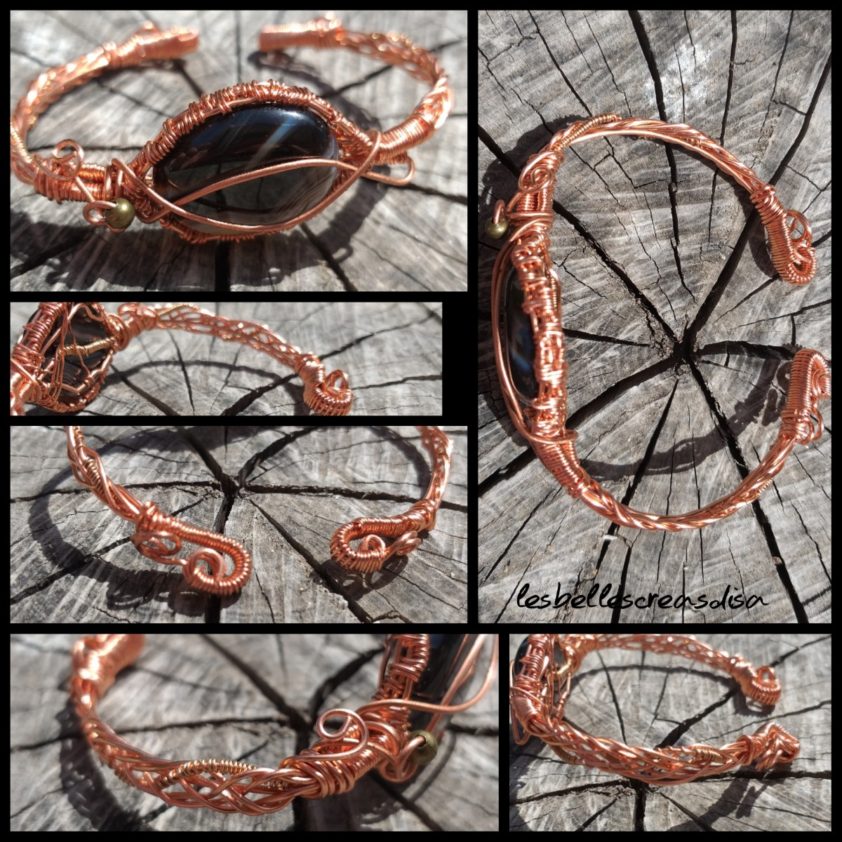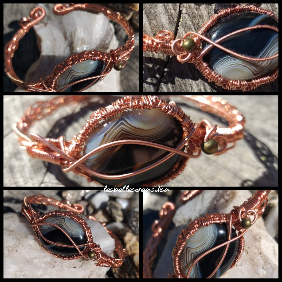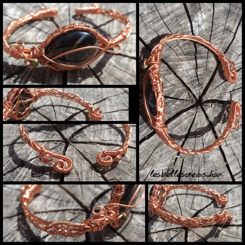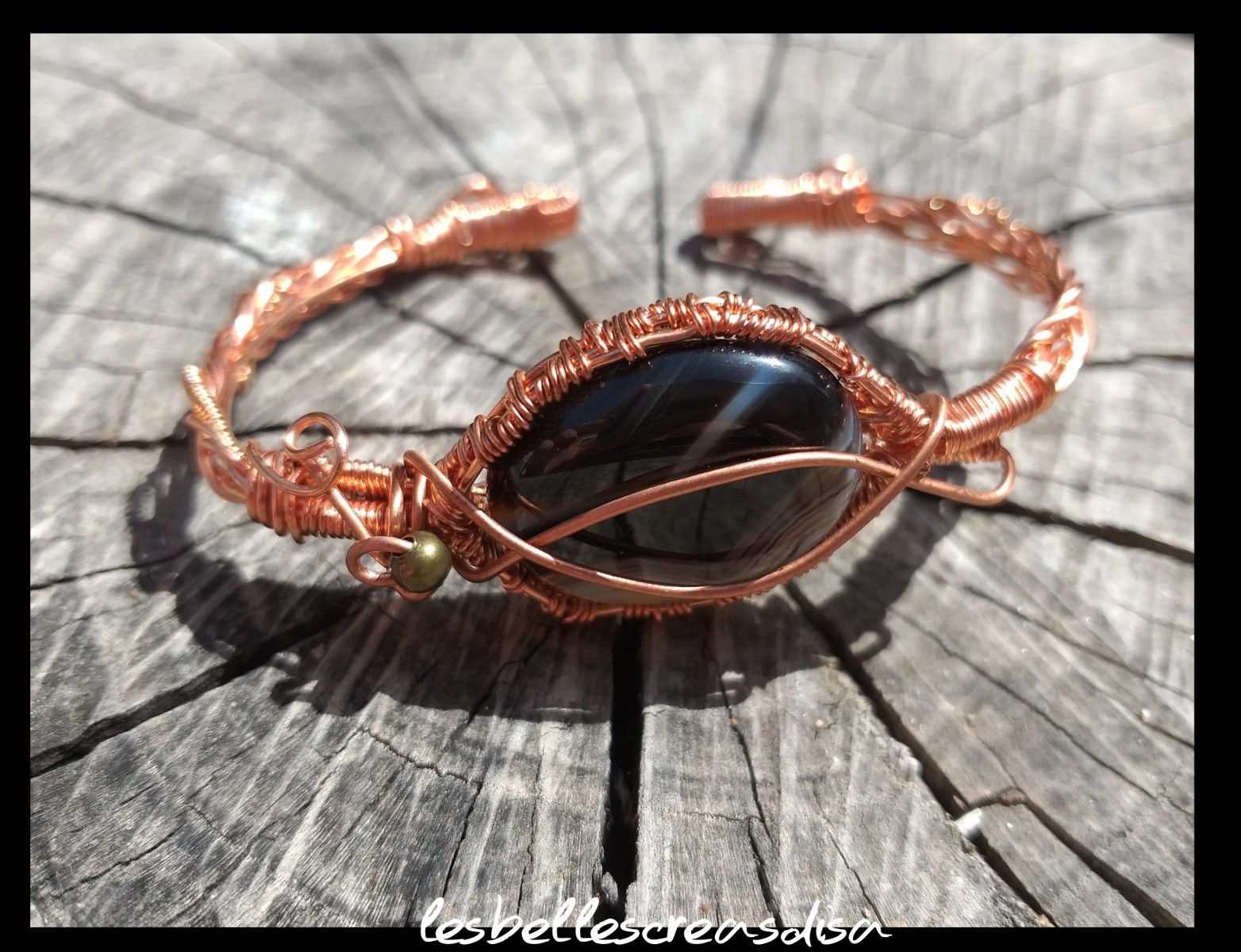 Bracelet artisanal en wire wrapping en cuivre et Cabochon en pierre naturelle d Onyx