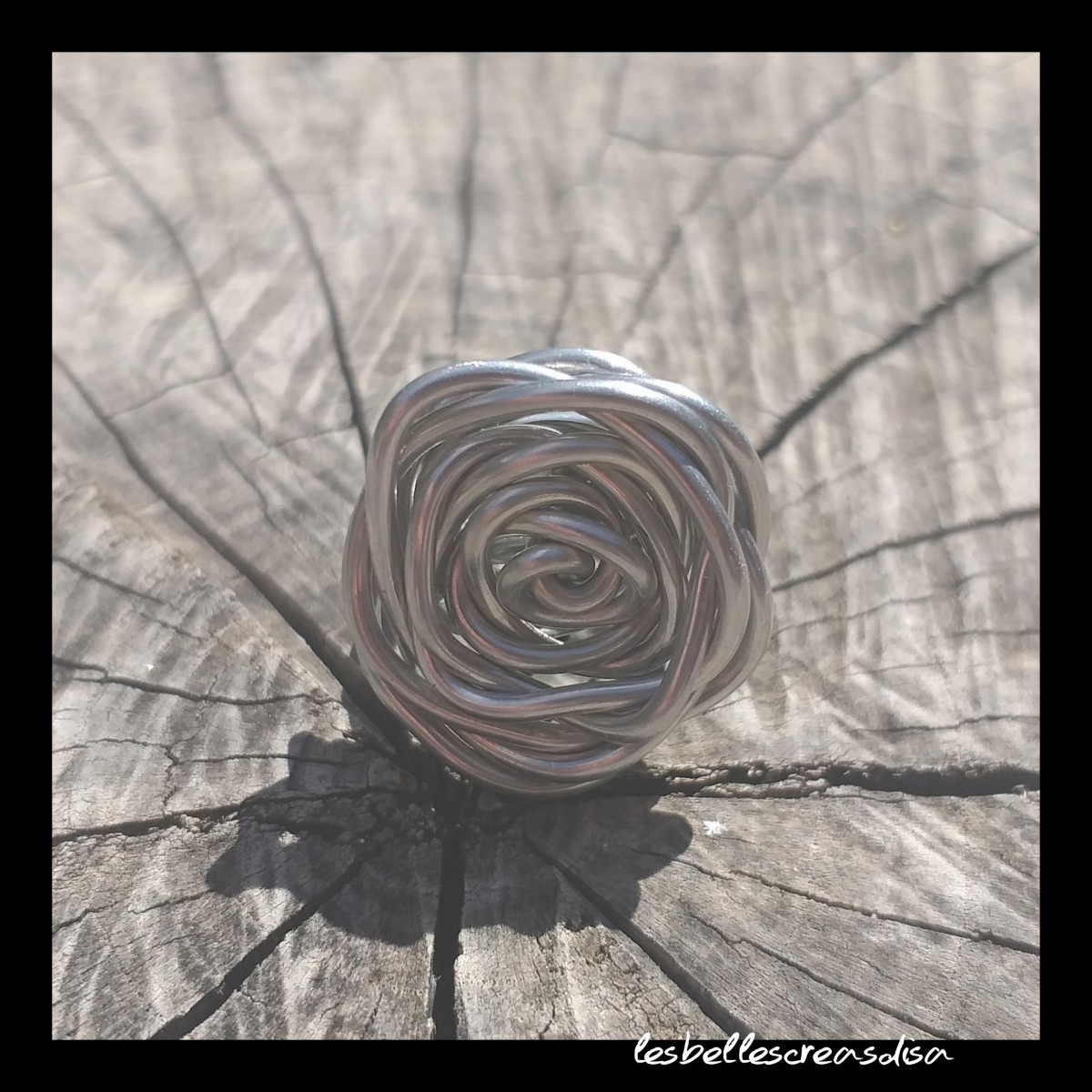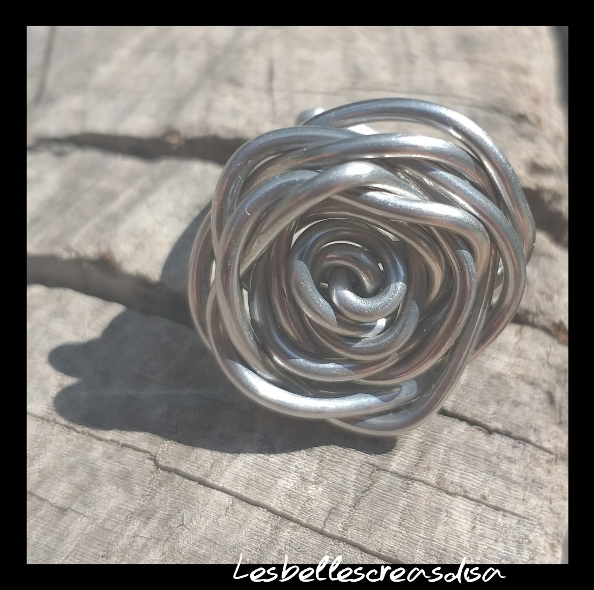 Jolie fleur grise, motif rose réalisée en fil d aluminium de couleur gris argenté