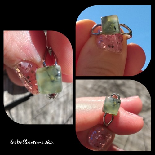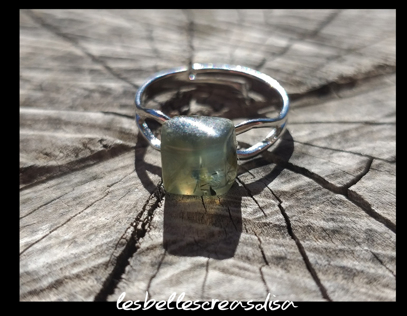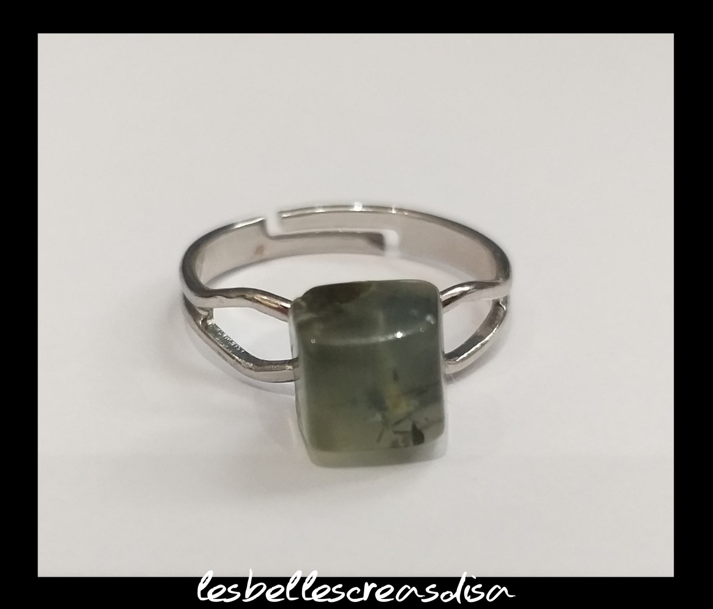 Bague composée d'un cabochon de forme carré en phrénite , pierre naturelle translucide de couleur verte sur support de bague réglable en acier inoxydable