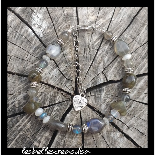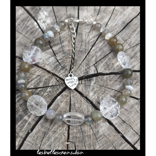 BRACELET LABRADORITE - Bracelet en perles pierres naturelles Labradorite et cristal de roche et peristerite, perles verre et charm coeur, idée cadeau anniversaire, fête ou pour faire plaisir, création fait main , modèle unique, bijoux femme