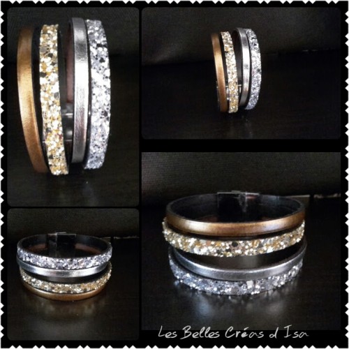 Bracelet paillettes en cuir or et argent Féerie d'hiver