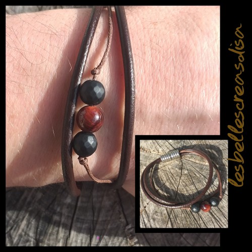 BRACELET CUIR ET PERLE NATURELLE OBSIDIENNE ACAJOU - Bracelet homme - bijoux lithothérapie