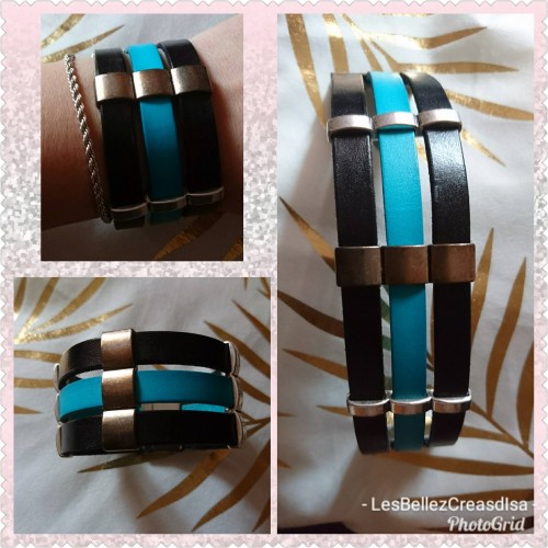 Bracelet cuir noir et turquoise , passant métal