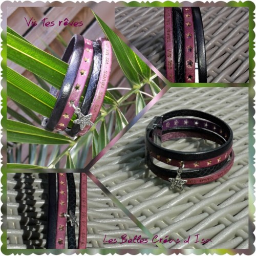 Bracelet en cuir "vis tes rêves" Noir et Prune - promotion