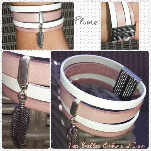 Bracelet cuir modèle Plume Rose et Blanc