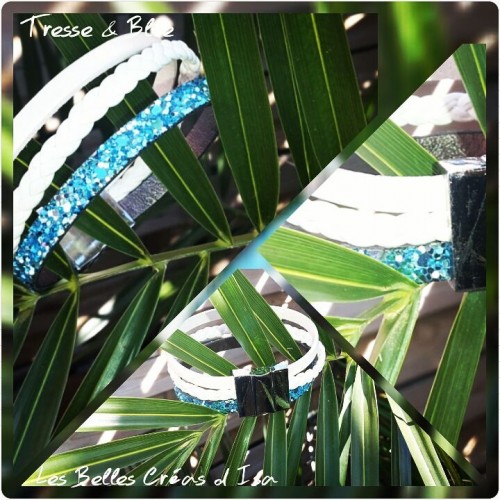 Bracelet Cuir Tresse & Blue - Bleu Turquoise Pailleté - Blanc Tressé et Blanc Nacré