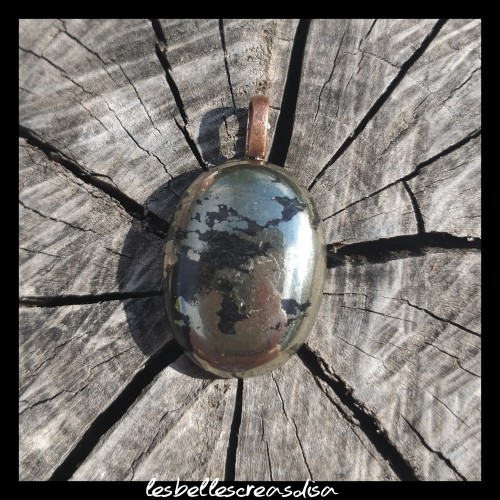 PENDENTIF OVALE PIERRE NATURELLE APACHE GOLD - Pendentif Apache gold - cabochon ovale 25x19x5mm - bélière couleur cuivre - pierre naturelle chalcopyrite sur schiste noir - pierre naturelle noire et or - prospérité et abondance