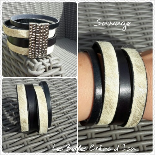 Bracelet cuir "sauvage" - Cuir Noir et "effet poils" beige - Promotion