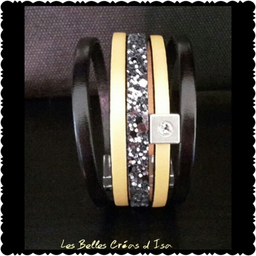 Bracelet cuir modèle Nouvel An - Noir et Jaune en cuir, strass et paillettes