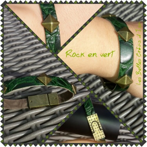 Rock en vert - Bracelet cuir souple et rivet