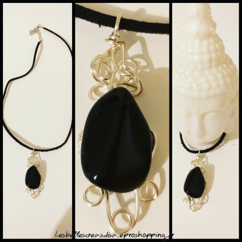 Collier suedine noire et obsidienne, pendentif wire wrapping fait main