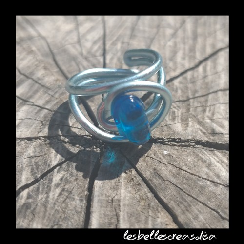 Bague bleue polaire en fil d aluminium lisse et jolie perle bleue transparente, bague réglable femme en aluminium bleu pâle, magnifique perle bleue translucide , bijoux fait main par les belles créas d isa